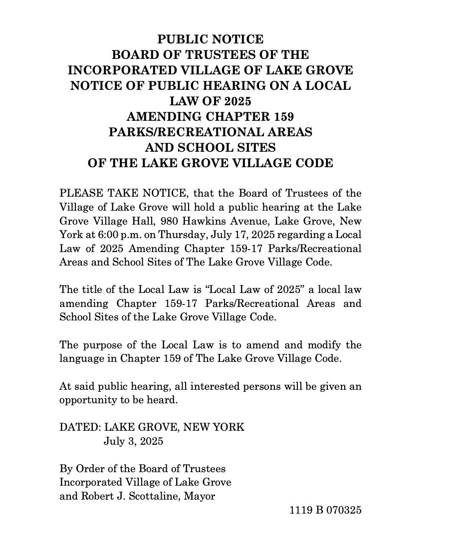 PLEASE TAKE NOTICE, that the Board of Trustees of the Village of Lake Grove will hold a public hearing at the Lake Grove Village Hall, 980 Hawkins Avenue, Lake Grove, New York at 6:00 p.m. on Thursday, July 17, 2025 regarding a Local Law of 2025 Amending Chapter 168 Vehicles and Traffic of The Lake Grove Village Code.